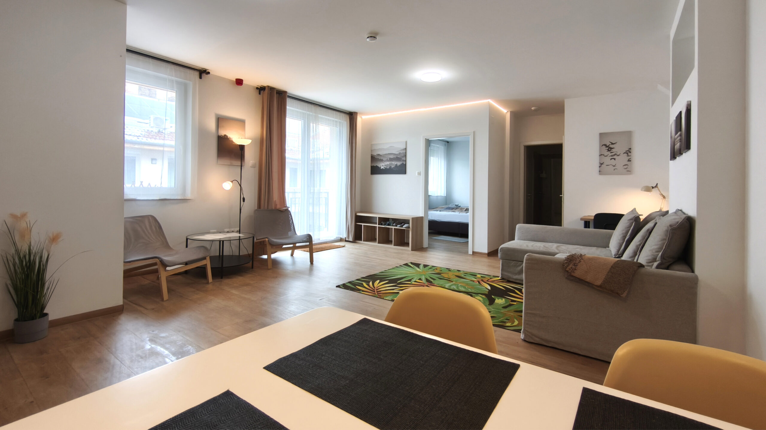 Choose our one-bedroom apartments with a balcony or facing the street. The living room has a pull-out sofa, so they provide comfortable accommodation for up to 4 people.